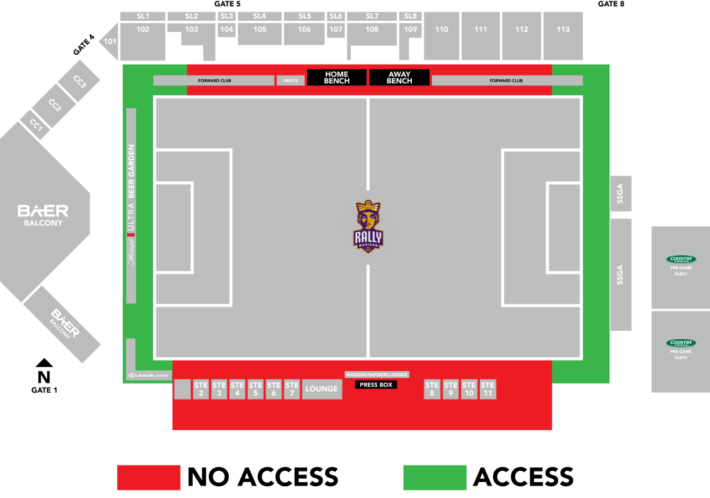 There will be no field access. Reporters must remain in designated location during run of play and must always remain out of the sightlines of any fans in the stadium. Reporters should not enter the playing field, locker rooms or other Restricted Areas proximate to players, coaches, Club delegation members unless specifically escorted or permitted by Rally Madison FC.